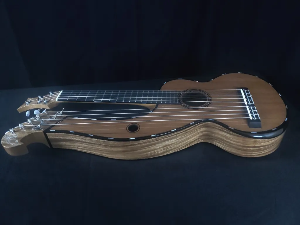 My guitar teacher suggested that I put an inquiry on the Harp Guitars group facebook page and I soon received a response from Rob, saying he could and would love to make a five string baritone harp ukelele for me. The rest is history. It is absolutely perfect and the sound is marvelous.”