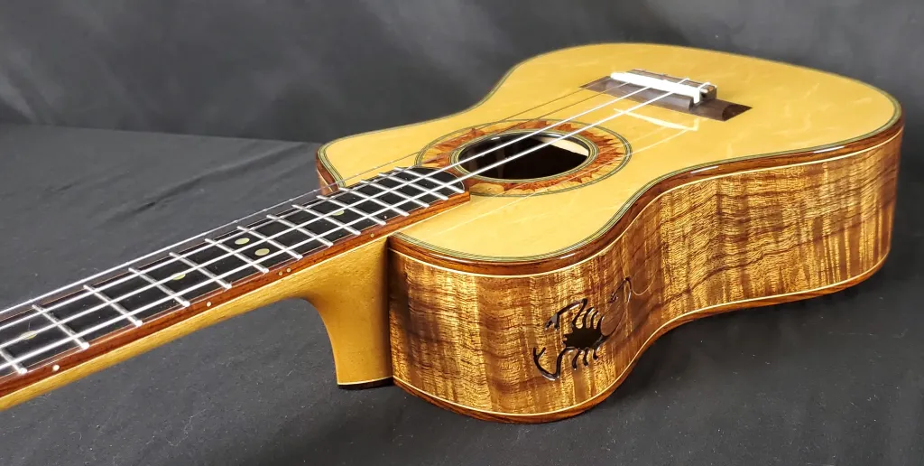 “Working with Rob (Scorpio Guitars & Ukuleles) was delightful. I enjoyed the entire process of selecting all the components of my custom ukulele. The craftsmanship of my super tenor was beyond my expectations; it’s truly a work of art. The bearclaw spruce top and koa sides/back make for a wonderful tone, and the instrument has great projection. If you are in the market for a custom instrument, I highly recommend working with Rob!”